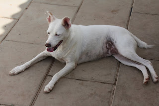 Branquinha é uma cadela adulta, esterilizada de porte médio.